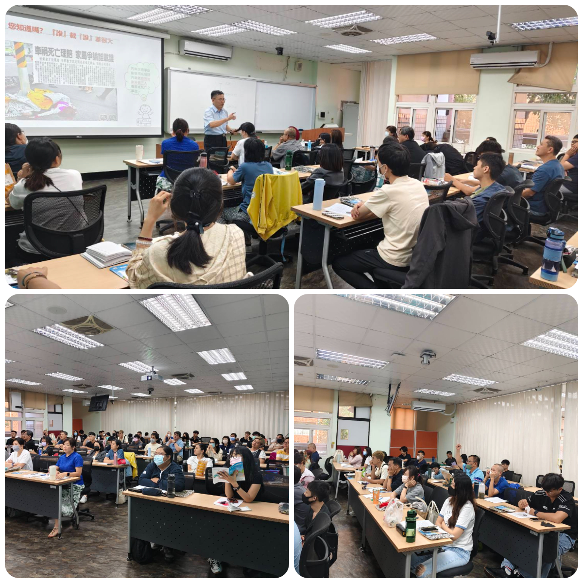 公告內容 | 強制車險教宣小組114年10月20日來到高雄,在空中大學辦理教育宣導活動,向學生說明交通安全的注意事項及強制汽車責任保險的觀念,張桐誠講師以深入淺出的方式的講解PPT簡報內容,配合交通事故影片輔助說明,加深學生印象。再搭配有獎徵答,與學生互動熱絡,活動圓滿完成。