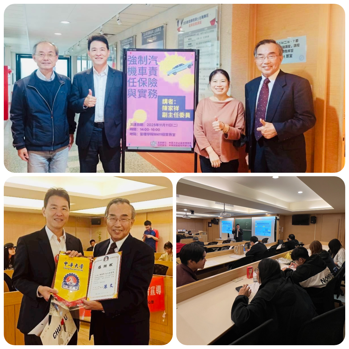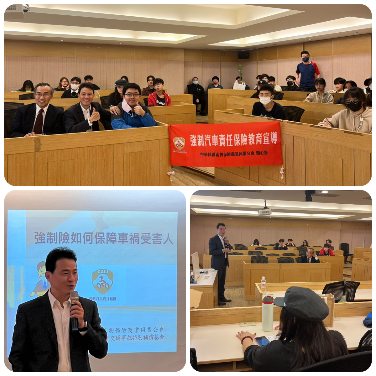 | 公告內容 | 強制車險教宣小組114年11月11日來到新竹,在中華大學辦理教育宣導活動,向學生說明交通安全的注意事項及強制汽車責任保險的觀念,陳家祥講師以深入淺出的方式的講解PPT簡報內容,配合交通事故影片輔助說明,加深學生印象。與學生互動熱絡,活動圓滿完成。